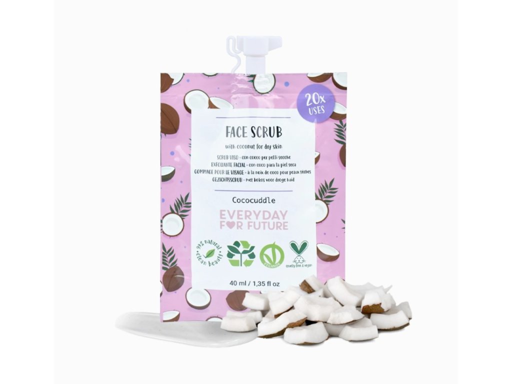 Pleťový peeling Cococuddle kombinuje jemnou exfoliaci rýžovými mikrogranulemi s výživou kokosového oleje, glycerinu a ricinového oleje, které pokožku nejen čistí, ale zároveň zklidňují a hydratují. Skvělý pro suchou, citlivou nebo unavenou pleť, která touží po jemnosti bez podráždění.