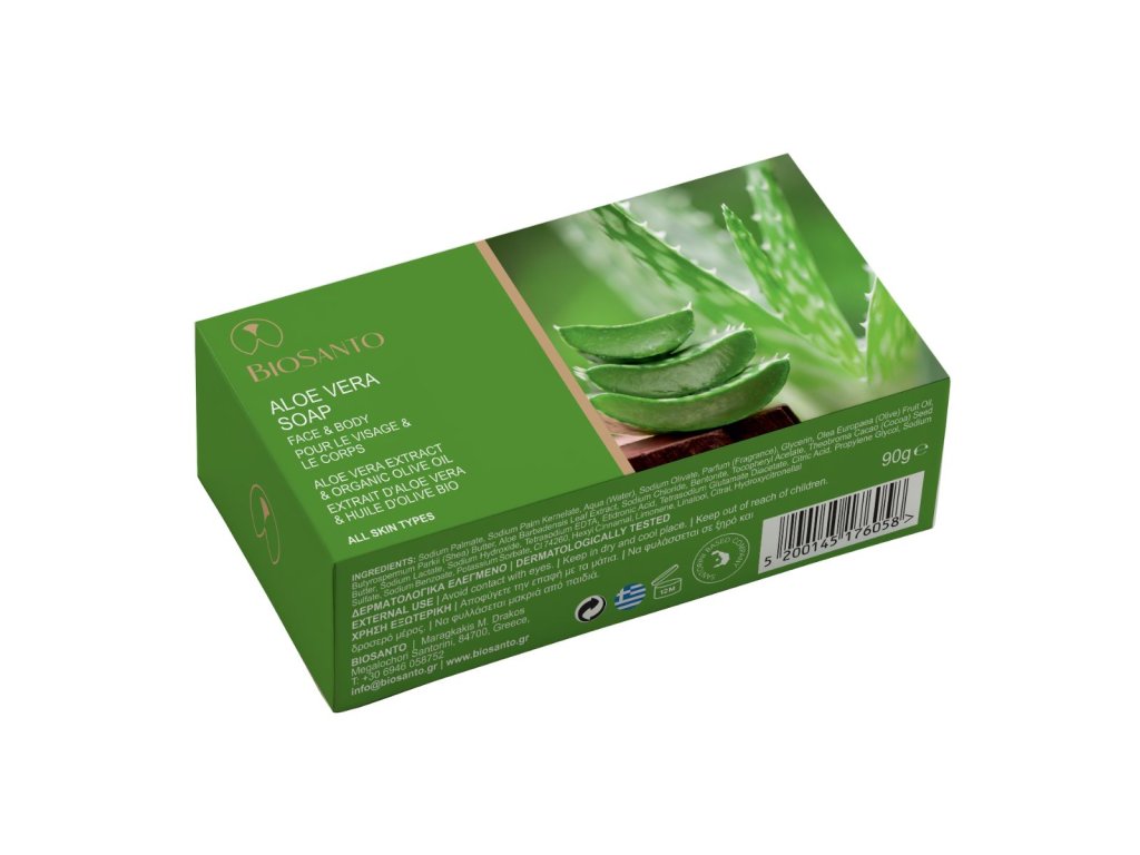 Mýdlo Biosanto s aloe vera jemně čistí, zklidňuje a hydratuje pokožku, zanechává ji svěží, hladkou a mladistvě vypadající.