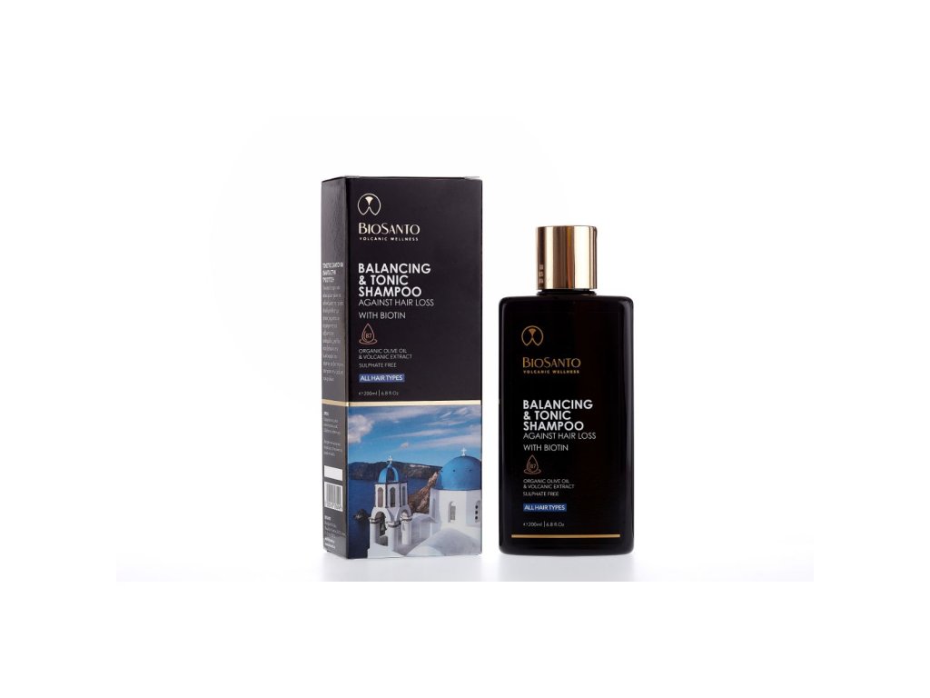 Tonizující šampon proti vypadávání vlasů Biosanto je speciálně navržený pro posílení vlasů a podporu zdravé pokožky hlavy. Jemné mycí složky, které šetrně čistí a zároveň vytvářejí příjemnou pěnu, neodstraňují přirozenou vlhkost ani ochranný lipidový film pokožky. Obsahuje mentol, který stimuluje krevní oběh, a biotin, který pomáhá předcházet řídnutí vlasů.